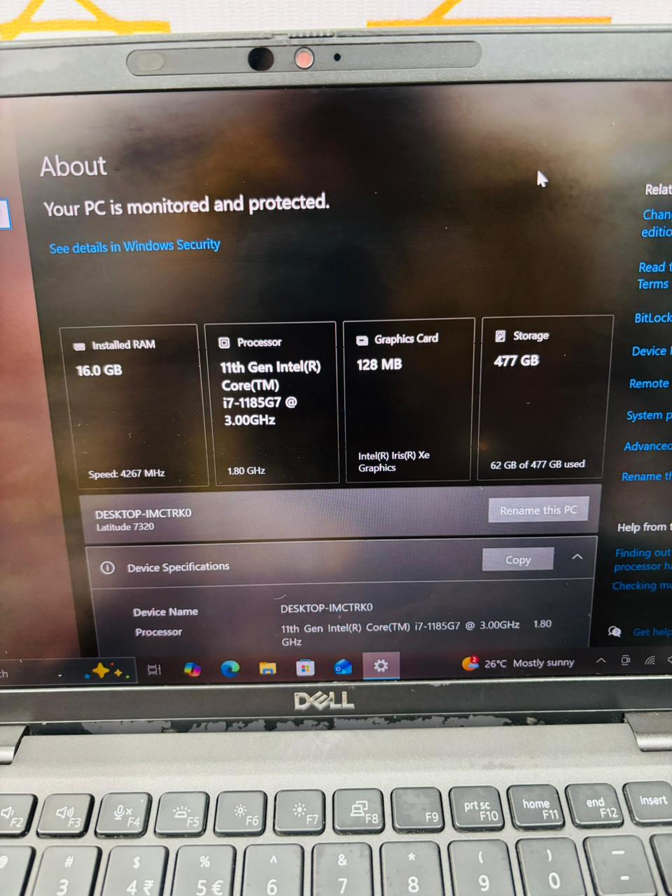 Dell Latitude 7320 laptop • Processor: 11th Gen Intel Core i7-1185G7 @ 3.00GHz • Memory (RAM): 16.0 GB • Storage: 477 GB